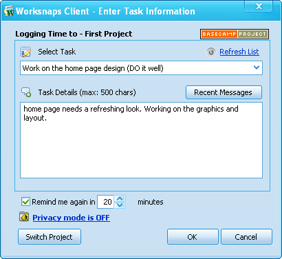 Worksnaps is smart enough to recognize projects coming from an integrated 3rd party site. It has a visual cue to allow easy recognition. When using Worksnaps to log time to a 3rd party project, a user does nothing different. Time will be captured and logged onto Worksnaps server, and will subsequently be synchronized to the 3rd party site. These steps happen smoothly behind the scenes.
